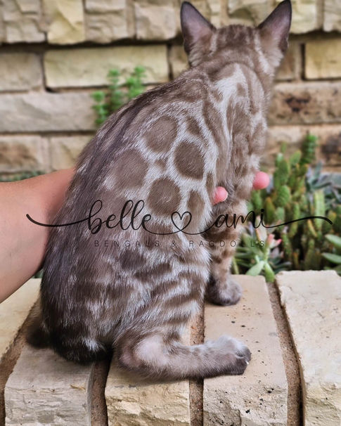 Ember is our stunning snow mink charcoal girl. She will have snow colored and brown colored Bengal kittens, unless I end up getting a male that can produce charcoal. Lol! Ember is full of energy, but very affectionate. She loves shredded chicken wet food and cat treats. She has the most beautiful eyes I've ever seen on a Bengal. As you can see from her baby pictures she has gotten a lot darker over the first year of her life. Her sweet face and loving personality are perfect for producing lovely little Bengal kittens. Thank you, Sandra for my sweet girl.